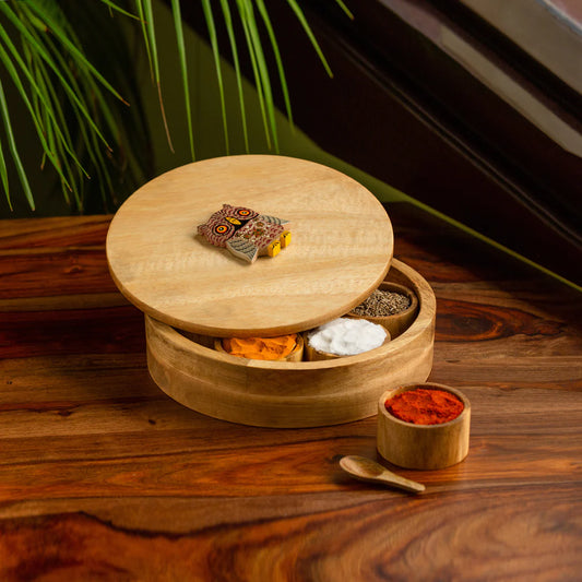 Mystic Owl Block Hand Carved Spice Box With Spoon In Sheesham Wood