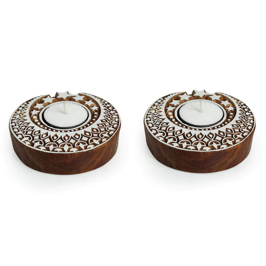 Shimmering Moon Hand-Carved Blocks Tea-Light Holders In Sheesham Wood (Set of 2)