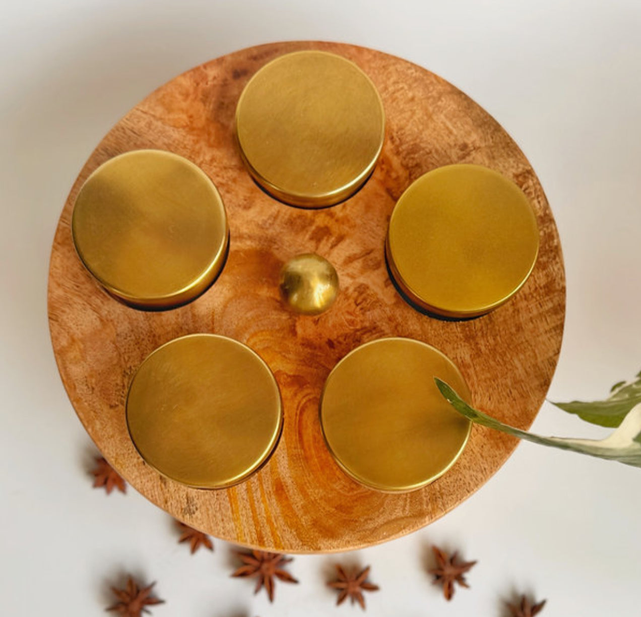 Beautifully crafted wooden spice box stand with stainless steel containers. This elegant spice box stand combines the rustic charm of wood with the modern sophistication of stainless steel. The sturdy wooden base provides a durable and aesthetically pleasing foundation, while the stainless steel containers keep your spices fresh and organized. Each container is designed to easily fit into the stand, making it simple to access your favorite spices while cooking. Perfect for any kitchen, this spice box stand is both functional and stylish, adding a touch of elegance to your culinary space.
